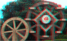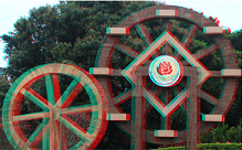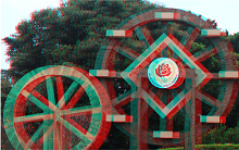 The stereoscopic effect of an image is created by the depth of foreground and background in a view. A 2D image on a piece of paper cannot have a stereoscopic effect. From presentation point of view a stereoscopic image is superior to a flat image. For example, Figure 1 is not as spectacular as those anaglyphic pictures in Figure 2 to 6. In a scene, it usually includes three sections; i.e., the foreground, the mid-ground, and the background. (In this article, the foreground means the most frontal portion of a scene and the background is the farthest end of a scene. The mid-ground is anywhere between the foreground and the background). For example, in Figure 1, the smaller wheel on the left is the foreground, the bigger wheel on the right is the mid-ground, and the trees in the back constitute the background.